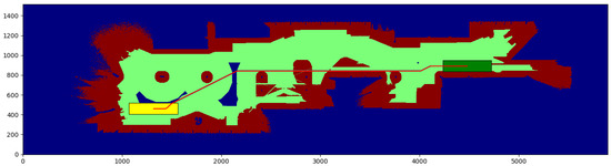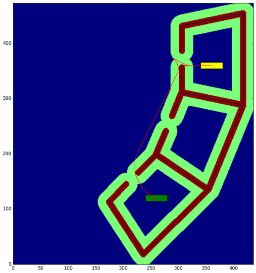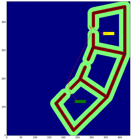The cubicle test (Table 1) is conducted in a small environment of 10.9 × 11.825 m, with a resolution of 0.025 m per cell. We obtain the paths between the start and end points shown in Figure 8 and Figure 9, for a robot with a small rectangular footprint of 0.3 × 1.0 m. Both on the starting and ending positions, the robot is facing to the right. Since this map is very clear, the proposed method presents little advantage with respect to the one used as a reference (a time reduction of just 12.99%), as most of the path travels through clear zones, where obstacles are farther than the circumscribed radius. As it can be seen, the reduction in the average computation time per node is just 8.3%. A small path cost increase of 0.46% is due to the discretization errors that were previously described. These errors are also the cause for the 5.10% reduction in the number of visited nodes.