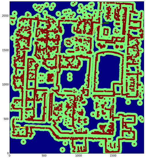 The willow test (Table 2) is conducted in a large environment of 48.675 × 55.275 m, with a resolution of 0.025 m per cell. We obtain the paths between the start and end points shown in Figure 10 and Figure 11, for a robot with a large rectangular footprint of 0.5 × 2.0 m. Both at the starting and ending positions, the robot is facing to the right. The environment is heavily cluttered compared with the robot’s size, so the proposed method presents great advantages with respect to the one used as a reference (a time reduction of 56.60%), as most of the paths must pass through cells where obstacles are inside the circumscribed radius. Now, the reduction in the average computation time per node is 28.0% Again, the path cost increase of 4.02% is due to the discretization errors, and these errors are also the cause of the 39.71% reduction in the number of visited nodes.