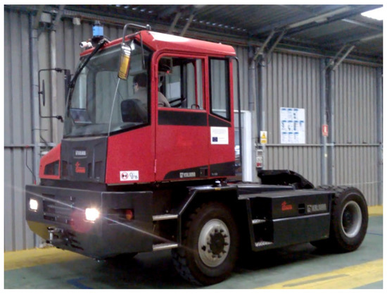 Real world experimental results were obtained with a robotized Kalmar Tugmaster truck (Figure 12 and Figure 13), in the framework of the Autoport project [25]. Here, the robotized vehicle was autonomouslly driven on a Ro-Ro ship hold, whose map is shown in Figure 14, as well as on a 9.5 m × 39.1 m narrow environment at a warehouse, which was also cluttered with several hydraulic jacks and other furniture. The truck had a width of 2.5 m and a length of 12.3 m.
