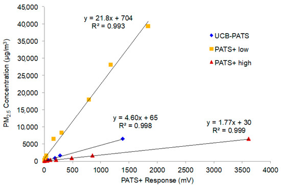 Relationships between PATS+ photoelectric response (low and high sensitivity channels in mV) and PM2.5 concentrations based on laboratory chamber tests. Each point represents 15-min mean concentrations during a particle exposure event. The Y-axis is based on calibrated DustTrak readings.