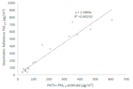 Figure 2 shows the correlation between the PATS+ and gravimetric samples from 48-h collocations in kitchens of families using traditional wood burning cookstoves in Alotenango, Guatemala. The strong linear correlation (R2 > 0.90) indicates that the PATS+ photoelectric signals responded well across the range of particulate matter concentrations under real-world conditions. PATS+ output did consistently underestimate actual concentrations, but this can be addressed with in-field calibration.