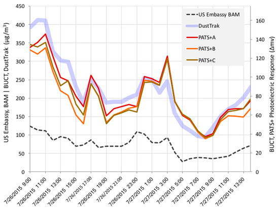 Hourly average trace of responses from (1) co-located PATS+ units (change in mV from the photoelectric chamber), (2) a DustTrak (μg/m3, uncorrected PM2.5) near Beijing University of Chemical Technology (BUCT), and (3) the US Embassy BAM (μg/m3, PM2.5) located approximately four kilometers away.