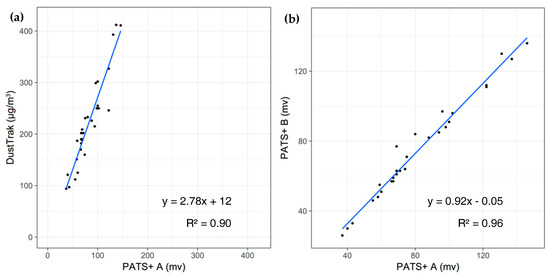 Correlation of (a) PATS+ and DustTrak and (b) PATS+ intra-instrument comparison during the Beijing monitoring period (see Figure 3). Each data point represents a one-hour average.