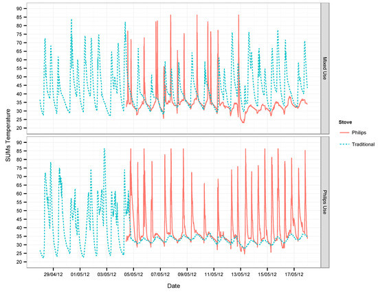 SUMs data from households with different usage patterns. Panels show temperature traces (degrees C) for a traditional stove (blue dashed line) and for the Philips, a fan-assisted intervention stove (solid red line). The top panel shows a household where the stove was incompletely used, with consistent use of both the traditional and intervention stoves. The bottom panel shows a household that moves from their traditional stove to the advanced cookstove. Adapted from [21].