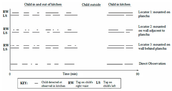 Direct observation vs. UCB-TAMS data for one mealtime observation. The lowest set of dashes represent time that the child was in the kitchen based on fieldworker observation—the ‘gold standard’. Adapted from Piccolo-Allen [33].