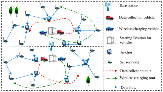 Figure 1 gives a vivid description of the whole network. The rechargeable sensor nodes can be divided into two classes: normal nodes and anchor points. Anchor points are the nodes collecting data from others. The normal nodes can transmit their own data to anchor points with multiple techniques. The base station is located at the central position of the whole network, which is used to process all data packets and charge the vehicles to maintain the continuous operation of the whole network. WCV and DCV are respectively the energy transmitter and data collector in the network. DCV collects data from each anchor point during the periodic tour of the entire network. Subsequently, DCV uploads the collected data to the base station. The charging request nodes are sorted according to the charging rules. Hence, the charging queue is constructed for WCV. Then the WCV tours the whole area to charge node one by one based on charging queue. Once WCV and DCV have lower energy, they return to the base station to replenish their energy.