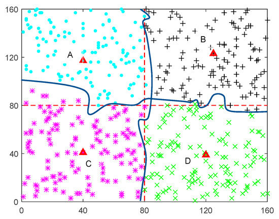 Figure 2 shows the results of network partition. The red dotted lines equally divide the network into four parts: A, B, C, D. That means the first partition. In addition, the red triangle points indicate the initial point of each region. Then we run the second partition based on these center points. The same shape and color symbols represent the node belong to a partition after operating partition algorithm. The blue lines represent the results of final partition. Obviously, some nodes belonging to area A before are assigned to the B and C regions.