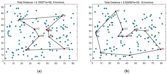 An example of anchor selections with 130 nodes under different touring bound Lb: (a) the total distance is 251 m and 9 nodes are chosen to be anchors with threshold Lb = 250 m; and (b) there are 10 anchors and the shortest tour length is 250 m with threshold Lb = 300 m.