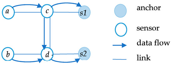 As shown in Figure 4, when the DCV stays in the anchor at s1, node a can forward packets along the link path . However, when the DCV stays in the s2, forwarding path from a is . When DCV is at different anchor, the packets transmission path of same node will be not the same. In addition, some nodes in the network can receive and transmit data packets at the same time in a real scenario. Thus, how to distinguish the functions of these nodes becomes the most important issue. In other words, we should recognize the direction of each link and determine the role of every node which represents sender or receiver to the other nodes. Thus, we use parents set and children set to distinguish different functions of each node, where represents presents set of node i while DCV is sitting at anchor a. Accordingly, represents the children set of node i when the data collection vehicle stops at anchor a. Importantly, the parents nodes and children nodes can communicate directly with the node i without forwarding other sensor nodes. In Figure 4, parent set of node c is and child set is when DCV is located at s1. However, when DCV sojourns at s2, and . Thus, the parent set and child set of the same node may be different if DCV is located at different anchor points. The entire network can be seen as a directed acyclic graph (DAG) through seeing each anchor as an end point. Modeling structured sensors as a network to study and is always using DAGs [19]. In [40], the parent node set of i were the neighbors that are close to the sink nodes. In the sensing area of the node, it mainly compared the distance between the node and anchor point and the neighbor node to the anchor point to get the direction of the link. Authors modeled a DAG by constructing the weight of outgoing edges of a node to the reciprocal of its residual energy and then using Dijkstra’s algorithm to produce a directed tree toward anchors [15]. In this paper, we make the nodes directly connected with the anchor as the anchors’ children set nodes. Then we get children set of others through its parents set. Repeat this process until the parents and children set are found. Based on this, we consider the network as node-exclusive interference model. A node cannot communicate two or more nodes at the same time. For each node in the area, there are three cases for energy consumption, i.e., . They represent average energy consumption on receiving, transmitting and sensing a data packet. The related parameters are shown in Table 1.