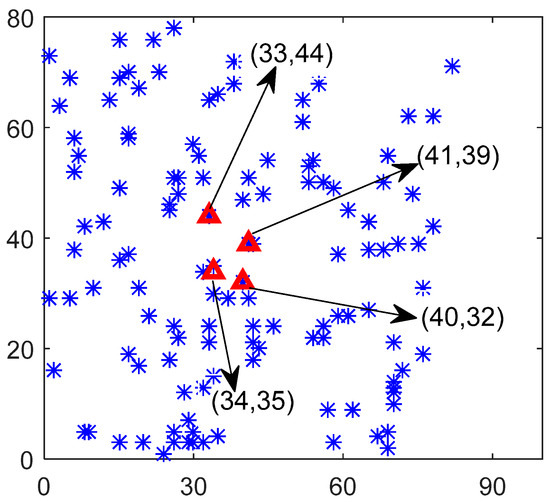 By experimental verification, we find that the initial center points in first partition and starting points for vehicles are close. Figure 5 and Table 3 show the experimental results on these two types of points. The red triangle points indicate the starting point of the two types of vehicles. The Cartesian coordinate (41,39) is the initial center point in the area. In the first place, it should be pointed out that the network density is changed after network partition. Now, we change the proportions of distance priority α and routing hop priority β in choosing starting position. Obviously, the starting position moves down when we decrease the proportion of routing hop. This is because the node density in left bottom is obviously higher than others parts. Thus, to reduce the distance consumption, the starting point must be move down. In addition, the starting position moves up when we increase the proportion of routing hop. This is because the nodes in top right corner are remote than others. Thus, to reduce routing hops influence of these nodes, the starting position should move up to maintain the routing hops minimally. Besides, we divide the network based on distance and routing hops with equal proportion. The node always chooses the initial center points with minimum distance and routing hops. Thus, when we change the proportion on distance and routing hop, the starting position will have corresponding changes. This shows that our algorithm of selecting starting position is very effective. Obviously, the starting point is almost at the center of each area, which effectively reduces the mobile energy consumption of the vehicles. Besides, we can verify that these nodes near starting position are likely to be chosen as anchors through anchor selection algorithm. This will reduce the forwarding data consumption greatly.