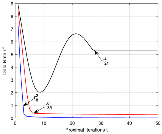 We first verify the data rate from node 21 to anchor 4, node 8 to anchor 2, and the node 35 to anchor 6 with a utility weight 1. Figure 6 shows the node data generation rate after several iterations. It can be seen from Figure 6 that data rates oscillate at the beginning, and then tend to fluctuate gently and achieve convergence finally. This is because the iteration step is larger in the initial stage, will be assigned to making change larger and the range of oscillation is more obvious after each iteration. With the increase of the number of iterations and reduce the iterative step size, the node data rate tends to be smooth, and the value of will go smoothly. Besides, the algorithm tends to achieve convergence and all variables go to convergence finally. This is an interactive process.