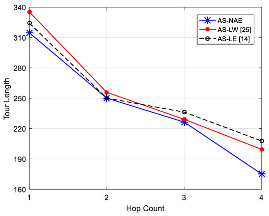To gain a better understanding of the impact of different parameter settings on the overall network performance, we first study the performance of different anchor selection algorithms as the function of cluster size k in terms tour of length. About 130 sensor nodes are uniformly distributed in the 85 m × 95 m sensing area after partitioning network and the sensing range and initial energy of each node remain unchanged in different anchor selection algorithm. We provide two schemes for performance comparison, including AS-LW and AS-LE. As mentioned earlier, in [25], the node with the largest weighted average was chosen as the anchor point, named AS-LW. In [15], authors chose the node with largest value as the anchor by constructing the least energy of each sensor’s neighbors within k hops, called AS-LE. As shown in Figure 8, obviously, the tour length of DCV decreases as the k increases. This is because the number of nodes within each anchors’ range increases as the cluster size increases, which decreases the number of anchor points and the tour length. Besides, we can see that the proposed algorithm can reduce the tour length effectively compared with the method of Based battery. This is because the Based battery method concentrates on the least battery energy within k hops. Thus, there is an extreme situation. The minimum battery energy within k hops will be same for multiple nodes closely. However, when and are equal for candidate anchor in anchor selection algorithm, where , we choose the serial number of energy higher as anchor first to avoid the same scene in above methods. Thus, the proposed approach has an advantage gained over others.