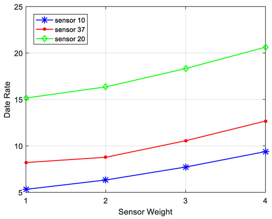 In this paper, network utility refers to the amount of data generated by all nodes in the sensing area. There are a series of factors that could have an important effect on network performance, for example, utility weight, DCV speed and the sojourn time at each site. Figure 9 shows the impact on the network performance while movement speed of the DCV and the sojourn time at each site changing. Assume that the data collection cycle is dynamic, which means DCV tours the entire network as a collection cycle. It is clear that data amount is more while keeping the speed of DCV unchanged and sojourn time increasing. By adjusting the sojourn time at each site, DCV can collect more data until all data collected meaning the line smoothly. Besides, we consider the effect of different moving speeds on the overall network performance when the sojourn at each anchor is same. In a fixed collection cycle, the DCV can tour many times in overall network. Thus, more data can be collected as the speed of DCV increases. Figure 10 shows the impact of utility weight on data rate. Obviously, to keep the weights of other nodes unchanged, we find that the data rate increases with higher utility weight keeping the utility weight of other nodes unchanged. In addition, we can use the nodes with higher weights as anchor points to avoid the energy consumption on sending and receiving data and reduce the delay of data collection in the process of data collection.