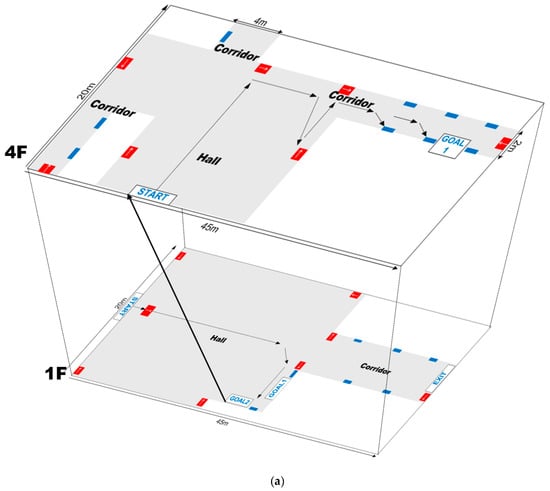 When they were on the first floor (the bottom layer of Figure 17a,b), they had to first visit the information center to get the place numbers for the destinations, and then, they had to move to the target floors using the elevator. Thus, they had two goals on the first floor; finding information center and taking an elevator. Additionally, the test map in top layer of Figure 17a had one goal and the test map in top layer of Figure 17b had two goals, respectively. All these goals could be found by recognizing the QR codes of the information center, elevator, toilet, and office.