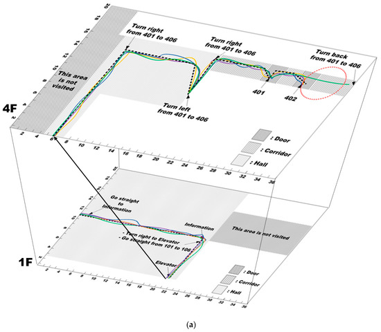 Figure 18 shows the paths of the four users when moving in the test maps shown in Figure 17. In Figure 18, the three patterns represent the respective situation types recognized by using the proposed method. As seen in the figure, the proposed system accurately recognized the situations. The black dotted line represents the optimal route created by sighted people, and the other color lines represent the paths of each user. The red circles indicate positions where errors occurred.