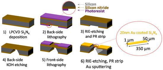 A conventional microfabrication technique was employed for a reproducible, high-throughput, and low-cost microneedle sensor. As illustrated in Figure 1, the following steps were taken to fabricate the microneedle: (1) 1 μm thick low stress silicon nitride (Si3N4) film was formed by low-pressure chemical vapor deposition (LPCVD); (2) photolithography patterning on the back side; (3) reactive ion etching (RIE) of Si3N4 film to open the back side for wet etching; (4) anisotropic undercut etching of Si with potassium hydroxide (KOH) to make a free-standing cantilever structure (1 μm in thickness); (5) photolithography on front side of wafer to define the microneedle; (6) RIE to complete microneedle pattern and deposition of 10 nm-thick chrome (Cr) then 20 nm-thick gold (Au) layer via sputtering. Chrome was added to act as an adhesion layer between the gold layer and Si3N4.