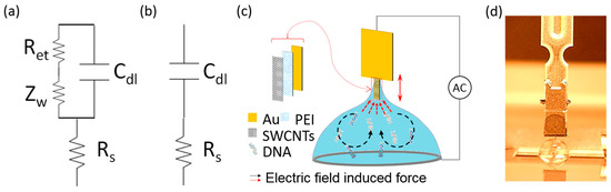 The equivalent circuits for the electrochemical measurement can be seen in Figure 2a, which is composed of the ohmic resistance of the electrolyte solution (Rs), the Warburg impedance (Zw) resulting from the diffusion of ions from the bulk electrolyte to the electrode interface, the double layer capacitance (Cdl), and electron transfer resistance (Ret) that exists if a redox probe is present in the electrolyte solution. Due to the suppression of redox reaction in DI water, the characterizing parameters for electron transfer, Ret and Zw, become infinite, and the equivalent circuit can be simplified to Figure 2b [18]. Since Rs represents bulk properties of the electrolyte solution, it is not affected by chemical transformations occurring at the electrode surface. Therefore, the build-up of the sensing analyte on the electrode surface mainly alters the double layer capacitance, Cdl. Therefore, cyclic voltammetry (PARSTAT 4000 potentiometer, AMTEK Princeton Applied Research, Oak Ridge, TN, USA) was also performed in DI water with bare gold, 1% PEI-coated, PEI/SWCNTs-coated, and functionalized microneedles with captured DNA to illustrate a change in the double layer capacitance.
