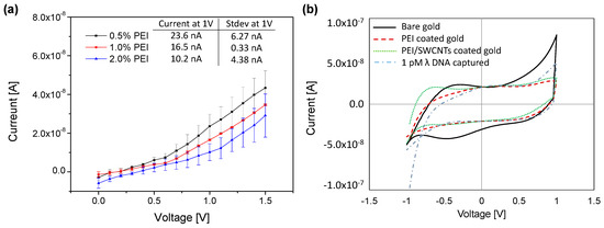 (a) IV curve for the SWCNTs coated microneedle with various concentration of PEI; (b) Cyclic voltammetry for four different types of surfaces: bare gold, 1% PEI-coated, 1% PEI/SWCNTs-coated microneedle, and 1 pM λ DNA captured needle.