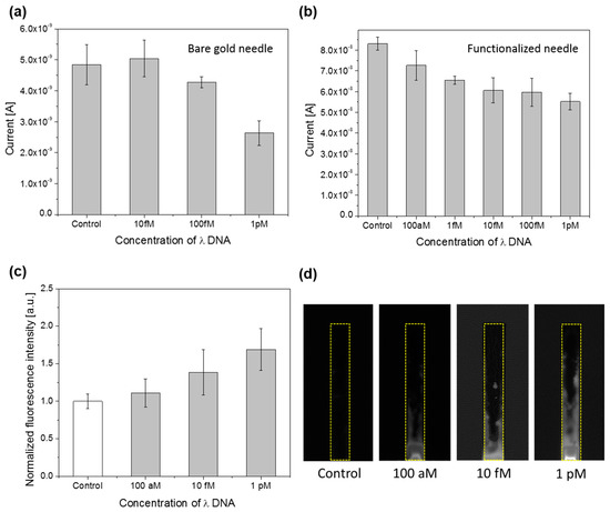 Electrical measurement results, with error bars showing standard deviation, for (a) the bare microneedle and (b) the functionalized needle at 1.1 V. Upon presence of DNA on the microneedle sensor surface, the current is decreased; (c) Fluorescence measurement results with bars showing standard deviation, for the functionalized microneedle. Fluorescence signal increased with increasing DNA concentrations; (d) Fluorescence images for control, 100 aM, 10 fM, and 1 pM.
