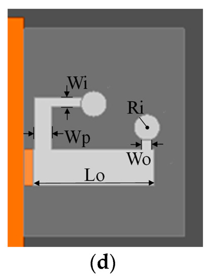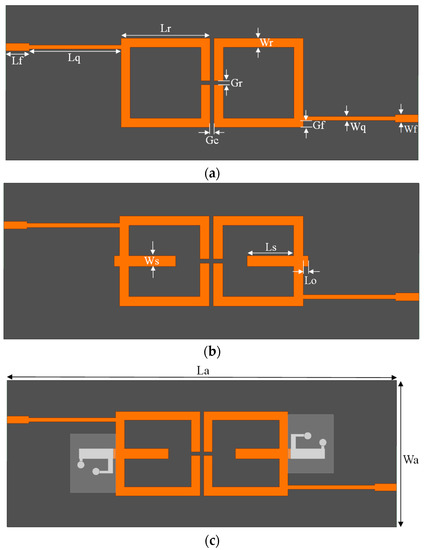 In this paper, we present a dual-band BPF with a fixed low-band resonant frequency and a fluidically-tunable high-band resonant frequency. The design of the proposed BPF is based on a coupled resonator filter that uses two split-ring resonators, as shown in Figure 1a. To realize the dual-band BPF, we add a stub to the coupled resonator filter, as shown in in Figure 1b. Finally, we add a microfluidic channel to the coupled-resonator filter with stub to create the frequency-controllable filter shown in Figure 1c. The detailed design of the microfluidic channel for frequency switching, which is created using polydimethylsiloxane (PDMS), is shown in Figure 1d. The values of the parameters in Figure 1 are La = 80, Lr = 17.3, Lf = 4.492, Lq = 17.823, Ls = 9, Lo = 1, Lc = 7.065, Wa = 30, Wr = 1.8, Wq = 0.83, Wf = 1.5, Ws = 2.1, Wp = 1, Wi = 0.55, Wo = 0.6, Gr = 0.77, Gc = 0.77, and R(SA (θ)) = 0.75 [mm].