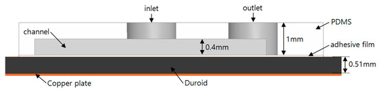 Figure 2 shows the side view of the proposed filter. The proposed filter consists of a copper plate, Duroid substrate, adhesive film, and PDMS. The bottom layer is the copper plate, which acts as the ground. The substrate for the proposed filter is a 0.51 mm thick Duroid 5880 substrate (Rogers, Killingly, CT, USA), with a permittivity of 2.2. The adhesive film bonds the Duroid substrate and the PDMS layer. We used 0.05 mm thick ARcare® 92561 (Adhesives Research, Glen Rock, PA, USA) for the adhesive film which can be simply attached on the PCB substrate without any post processing. PDMS, with a permittivity of 3.2, is used to create the microfluidic channel. The resonant frequency of the proposed filter is divided into two types of modes. The lower one is the odd mode and the other is the even mode. The odd-mode frequency (fodd) is related to the length of the split-ring resonator, which is Lr in Figure 1a. The relationship between the odd-mode frequency (fodd) and Lr is given by: