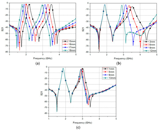 Simulated S21 of the proposed filter for: (a) different Lr; (b) different Ls; and (c) different Lc.