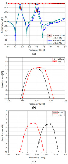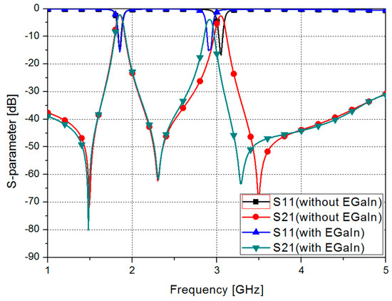 The S-parameters of the proposed filter are shown in Figure 4, for the different cases where liquid metal is injected and not injected into the microfluidic channel. The odd-mode frequency of the proposed filter without liquid metal is 1.85 GHz, and the fractional bandwidth is 4.32%. The even-mode frequency of the proposed filter without liquid metal is 3.05 GHz, and the fractional bandwidth is 2.96%. The odd-mode frequency of the proposed filter with liquid metal is 1.85 GHz, and the fractional bandwidth is 4.32%. The even-mode frequency of the proposed filter with liquid metal is 2.9 GHz, and the fractional bandwidth is 2.75%. From these results, it can be inferred that, when liquid metal is injected into the microfluidic channel, the odd-mode frequency is not changed, while the even-mode frequency is shifted by approximately 150 MHz.