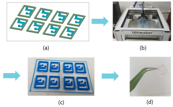 Figure 5 shows the fabrication of the PDMS microfluidic channel. First, we make a mold for the PDMS microfluidic channel, before fabricating it, because we cannot fabricate the PDMS channel using a 3D printer alone. To make the mold for the channel, we design a mold using a 3D modeler program, as shown in Figure 5a. The designed mold is realized using a 3D printer (Ultimaker2, Geldermalsen, The Netherlands), as shown in in Figure 5b. Then, we fabricate the PDMS channel using the mold. Figure 5c shows the fabricated mold. We create PDMS by solidifying the liquid made by mixing Sylgard184 Base and Sylgard184 Agent in the ratio of 10:1. We then fabricate the PDMS channel by pouring the mixed liquid into the mold and solidifying by heating for 30 min. Figure 5d shows the fabricated microfluidic channel.