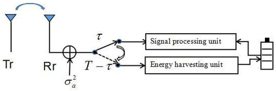 The TS mode, as shown in Figure 3, allows the receiver antenna to switch and utilize either the information decoder or the RF energy harvester for the received RF signals at a time. Hence, a time switching strategy is adopted as two phases: (i) the power transfer phase: during each coherence time interval T, the transmitter first transmits wirelessly the information to the receiver and then harvests energy for time slots; and (ii) the information transmission phase: the signal to the receiver for time slots is allocated to decode information. When the receiver works in the power transfer phase, the power harvested from the transmitter can be given as follows: