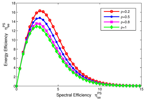 For the PS mode, the EE–SE relation presented in Equation (15) is showed in Figure 4. For comparison, the power splitting ratio is set to 0.2, 0.5, 0.8, 1. In Figure 4, we can see that an optimal peak value of the EE can be achieved in different levels of the power splitting ratio. In other words, the EE-SE relation does not conflict any more and the optimal tradeoff can be achieved. On the other hand, Figure 4 shows that the EE decreases as the power splitting ratio increases. In particular, means no energy harvesting, which indicates that the SWIPT system can enhance energy efficiency under the condition of the same spectral efficiency for PS mode.