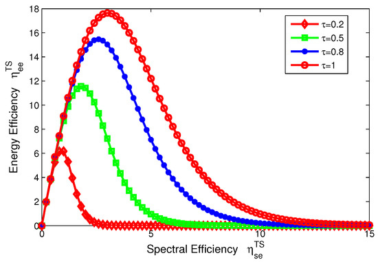For the TS mode, the EE-SE relation presented in Equation (18) is showed in Figure 5. For comparison, the time switching slot is set to 0.2, 0.5, 0.8, 1. In Figure 5, an optimal value of tradeoff between EE and SE can be obtained in different intervals of the time switching slot. Similarly, the EE–SE relation is not contradictory any more and the optimal tradeoff can be achieved. In addition, Figure 5 illustrates that the EE increases as the time switching slot increases as well as the spectral efficiency, which shows that the SWIPT system can achieve different EE–SE tradeoff levels by adjusting time switching slot for TS mode.