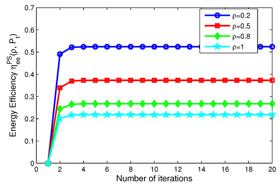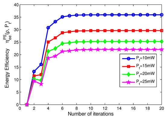 In addition, in Figure 6, Figure 7, Figure 8 and Figure 9, after only eight iterations, the proposed iterative algorithms achieve convergence for all considered scenarios. In addition, the convergence speed of the proposed algorithms is unchanged for different transmit power, power splitting ratio and time switching slots, which is expected for the practical SWIPT system.