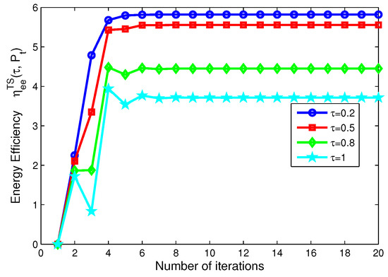 On the other hand, for TS mode, Figure 8 depicts the energy efficiency of the proposed algorithms for different transmit power versus the number of iterations. Figure 8 reveals that the larger the transmit power is, the lower the energy efficiency of system is, when mW, respectively. Figure 9 shows the energy efficiency of the proposed algorithms for different time switching slots versus the number of iterations. Figure 9 illustrates that the higher the time switching slot is, the lower the energy efficiency of system is, when 0.2, 0.5, 0.8, 1, respectively.