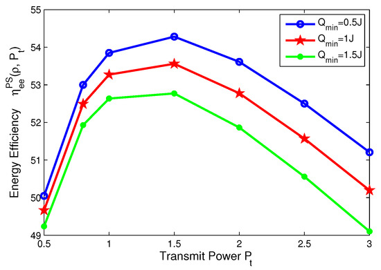 Energy efficiency versus transmit power with different minimum harvested energy requirements for PS mode.