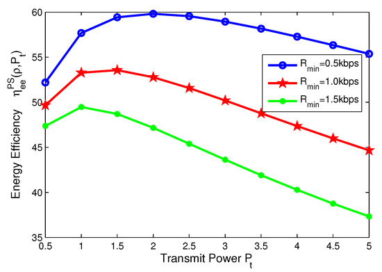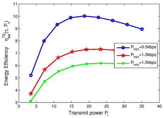 Energy efficiency versus transmit power with different minimum QoS requirements for TS mode.