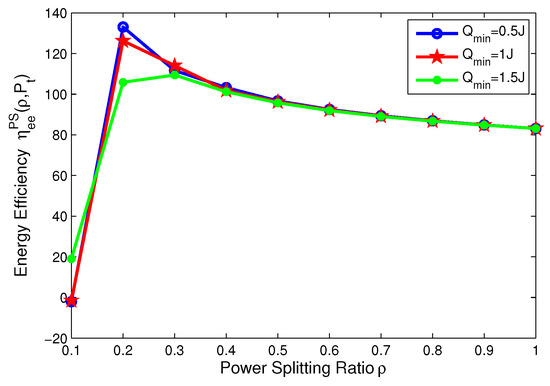 Energy efficiency versus power splitting ratio with different minimum QoS requirements for PS mode.