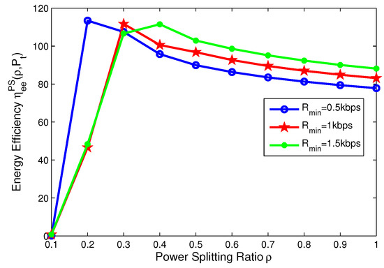 In this subsection, the effects of the minimum QoS and minimum harvested energy requirements on the energy efficiency are illustrated in Figure 10, Figure 11, Figure 12 and Figure 13, respectively. For PS mode, Figure 10 and Figure 11 show that the energy efficiency increases as the transmit power increases before achieving optimal peak value for different cases. Specifically, Figure 10 reveals that the larger the minimum harvested energy requirement is, the lower energy efficiency is. Moreover, Figure 13 shows that the larger minimum QoS is, the lower energy efficiency is. This is due to the fact that more power is allocated to guarantee reliable communication and harvested energy requirement. On the other hand, for PS mode, Figure 12 and Figure 13 show that the energy efficiency increases as the power splitting ratio increases when is small. After energy efficiency achieves the peak value, it decreases as the power splitting ratio increases. In Figure 12, the effect of minimum harvested energy requirement on energy efficiency is shown and the larger minimum harvested energy requirement is, the lower energy efficiency is, when . In Figure 13, for different levels of minimum QoS, the larger the minimum QoS is, the slower energy efficiency achieves optimal peak value at a time.