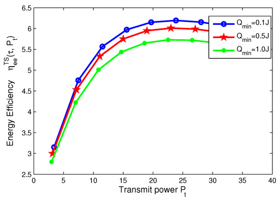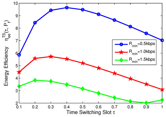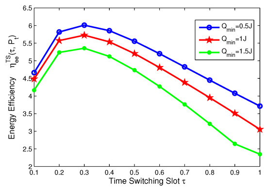 In this subsection, for TS mode, the effects of minimum QoS and minimum harvested energy requirement on energy efficiency are illustrated in Figure 14, Figure 15, Figure 16 and Figure 17, respectively. Specifically, in Figure 14 and Figure 15, with the increasing of transmit power, energy efficiency increases before achieving the optimal solution. It is shown from Figure 14 that the higher the minimum harvested energy requirement is, the lower energy efficiency is. In addition, Figure 15 shows that the larger minimum QoS requirement is, the lower energy efficiency is. On the other hand, in Figure 16 and Figure 17, the energy efficiency increases as the time switching slot increases before obtaining optimal value. After achieving peak value, energy efficiency decreases as time switching slot increases. In addition, Figure 16 shows that the larger the minimum harvested energy requirement is, the lower energy efficiency is as well as minimum QoS in Figure 17. These observations predict that the optimal value of time switching slot can be obtained to maximize energy efficiency of the SWIPT system by using our proposed algorithms.