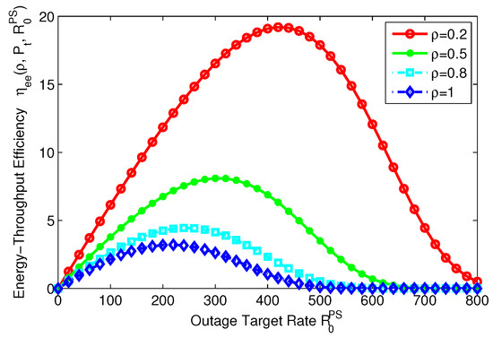 Energy-throughput efficiency versus outage target rate with different power splitting ratio for PS mode.