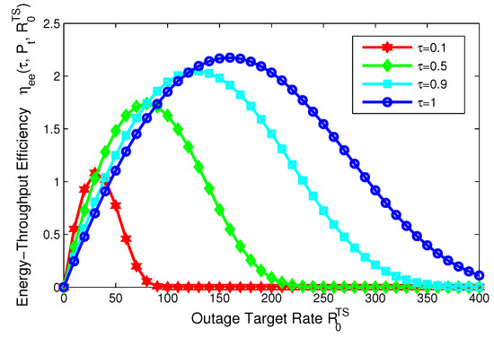 Figure 19 illustrates energy-throughput efficiency versus outage target rate with different time switching slots for TS mode. It is observed from Figure 19 that energy-throughput efficiency with respect to the outage target rate is quasi-concave. This observation means that the optimal value of outage target rate can be achieved to maximize energy-throughput efficiency for TS mode. In addition, the maximum of energy-throughput efficiency increases as the time switching slot increases. In a word, energy-throughput efficiency and outage target rate can achieve a tradeoff in the SWIPT system with PS, TS mode. From a green communication perspective, energy-throughput efficiency can be enhanced by designing a proper transceiver with different system parameters when the transmitter does not know or partially knows the CSI of the receiver.
