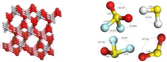 Figure 4 shows the adsorption structure of four gas molecules adsorbed on the F atom of the F-doped TiO2 crystal planes in different ways after complete optimization calculation. Due to the structural characteristics of four gas molecules, the way that the gas molecule adsorbed on the crystal plane was considered. Three situations are considered when the SO2 molecule comes close to the crystal plane in the optimization calculations, that is a single S and O atoms close to the crystal plane and two O atoms simultaneously close to the crystal plane. And the adsorption structures after calculation are shown in Figure 4a–c. Three cases were considered for H2S molecules: the single S, H atoms close to the crystal plane and two H atoms simultaneously close to the crystal plane. The calculated adsorption structures are shown in Figure 4d–f. SOF2 molecules mainly consider four cases: the single S, O, F atoms close to the crystal plane and two F atoms simultaneously close to the crystal plane, the calculated adsorption structure are shown in Figure 4g–j; the SO2F2 molecule is of a tetrahedral structure, and the S atom is inside the structure. So, SO2F2 mainly considers 4 cases: a single O, F atom close to the crystal plane, two O atoms and two F atoms are simultaneously close to the crystal plane, separately. The calculated adsorption structures are shown in Figure 4k–n.
