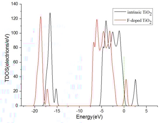 Figure 3 shows the curve of the density of states (DOS) of F-doped TiO2 and intrinsic anatase TiO2 (101) perfect crystal plane. It can be seen from the figure that the peak and shape of the density curve almost did not change after the fluorine atom being doped. The doping of the fluorine atoms hardly changes the band gap of TiO2. However, after fluorine element doping, the Ti4+ is converted to Ti3+, and the presence of a certain amount of Ti3+ will reduce the recombination rate of electron hole pairs [28]. Furthermore, fluorine element doping is conducive to the generation of oxygen holes and enhances the mobility of effective electrons [24,29], which can enhance the conductivity of the adsorbent substrate and improve the gas sensing performance of the fluorine-doped TiO2 nano array gas sensor mentioned above.