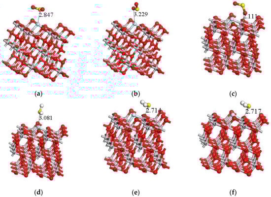 When H2S gas molecules with a single H atom close to the crystal plane and two H atoms simultaneously close to crystal plane, the adsorption structure after optimization calculation (Figure 4e,f) is almost the same, the calculated adsorption energy (−0.837 eV and −0.836 eV) and the amount of charge transfer (0.267 e and 0.266 e) is almost exactly the same, which is larger than the adsorption energy and charge transfer (−0.209 eV and 0.008 e) of the adsorption with single S atom close to the crystal plane. At the same time, the adsorption distance (2.835 Å) of the adsorption system obtained from H2S gas molecules with single S atom close to the crystal plane should be larger than that of the other two approaching ways (2.714 Å and 2.717 Å). Therefore, the H2S gas molecules are much easier to adsorb onto the crystal plane with a single H atom close to the crystal plane and two H atoms simultaneously close to the F-doped TiO2 crystal plane. When the H2S gas molecules are adsorbed on the crystal plane, the amount of charge transferred to the crystal plane is about 0.266 e, and the macroscopic gas sensitivity of the gas sensor shows the decrease of the impedance.