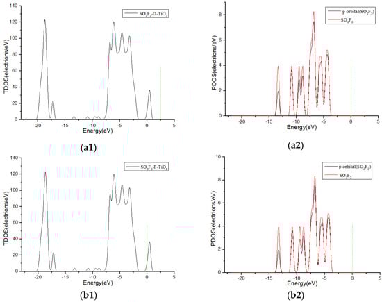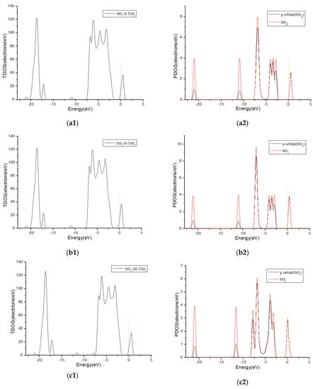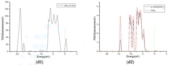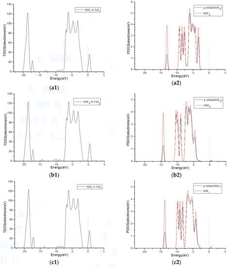 Figure 6 shows TDOS and PDOS curves of H2S molecules adsorbed onto F-doped TiO2. When the H2S gas molecules close to the F-doped TiO2 crystal plane with single S atom, the gas molecules have little contribution to DOS at 0 eV in Figure 6(a1,a2). However, when H2S molecules approach the F-doped TiO2 crystal plane with single H atom and two H atoms at the same time separately, the molecules have a significant contribution to the DOS on the right side of 0 eV in Figure 6(b1–c2). This corresponds to the charge transfer amount (0.008 e, 0.267 e and 0.266 e, respectively) when the H2S molecule close to the crystal plane with single S atom, single H atom and two H atoms at the same time in Table 1. It is shown that H2S molecules are more likely to be adsorbed on the crystal plane approaching in the form of a single H atom and two H atoms at the same time. Similarly, SOF2 gas molecules are more likely to adsorb by single O, single F atom, and two F atoms at the same time when coming close to the crystal plane than by single S atom. The TDOS and PDOS curves of SOF2 adsorption systems are shown in Figure 7. The theoretical analysis shows that H2S and SOF2 gases lose electrons when adsorbed onto the fluorine-doped TiO2 nano sensors, and the macroscopic gas-sensing properties show a decrease in impedance. Furthermore, the changed value of impedance of H2S is bigger than SOF2.