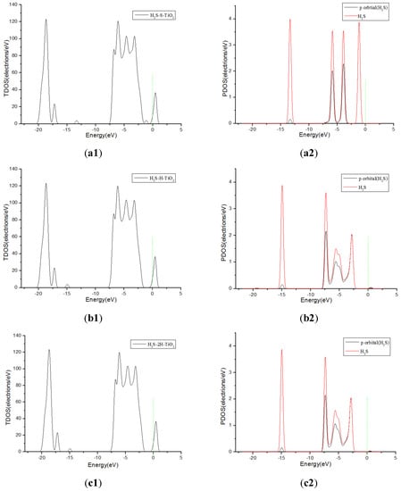 TDOS and PDOS of H2S molecules adsorbed onto F-doped TiO2, and the green short dashed line is Fermi level. (a1,a2) are the TDOS and PDOS of H2S-S-TiO2, (b1,b2) are the TDOS and PDOS of H2S-H-TiO2, (c1,c2) are the TDOS and PDOS of H2S-2H-TiO2.