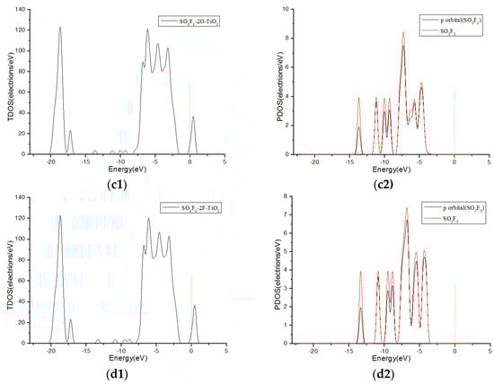 TDOS and PDOS of SO2F2 molecules adsorbed on F-doped TiO2, and the green short dashed line is Fermi level. (a1,a2) are the TDOS and PDOS of SO2F2-O-TiO2, (b1,b2) are the TDOS and PDOS of SO2F2-F-TiO2, (c1,c2) are the TDOS and PDOS of SO2F2-2O-TiO2, (d1,d2) are the TDOS and PDOS of SO2F2-2F-TiO2.