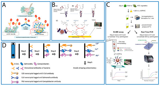 In particular, a disposable electrochemical immunosensor for multiplexed detection of food-borne pathogens (E. coli O157:H7, Campylobacter and Salmonella) was proposed by Viswanathan et al. [48]. The immunosensor was fabricated by immobilizing a mixture of antibodies, against the three target bacteria, onto the surface of a multiwalled carbon nanotube-polyallylamine modified SPE (MWCNT-PAH/SPE). Once the antigen–antibody interaction occurred, the sandwich was completed by adding three specific antibodies conjugated with different quantum dots (CdS, PbS, CuS for E. coli O157:H7, Campylobacter and Salmonella, respectively). After a dissolution step, the metallic component of the QDs were released and three well-distinguished current peaks were obtained using Square Wave Anodic Stripping Voltammetry (SWASV), a very effective and widely adopted technique for high sensitivity metal analysis (Figure 1D). The authors demonstrated that MWCNT-PAH/SPE film enhanced the peak currents (if compared to bare SPE and PAH/SPE) due to its particular electrical properties. The analysis time was about 4 h and the detection limit of the assay was found to be 400 CFU/mL for Salmonella and Campylobacter, and 800 CFU/mL for E. coli. The potential of this immunosensor for multiplexed analysis in food samples was proved by the authors analyzing fresh bovine milk spiked with high concentrations (104 CFU/mL) of the three target bacteria.