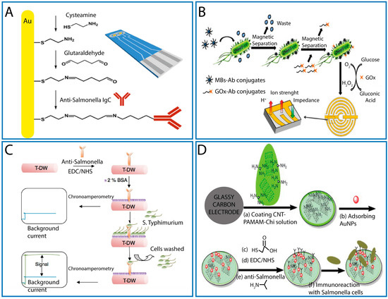 An easy to fabricate impedimetric immunosensor was described by Xu et al. [54] for the detection of S. Typhimurium. It was based on the use of MBs for separation and a screen-printed interdigitated microelectrode (SP-IDME) as transducer. MBs, coated with streptavidin, were firstly functionalized with specific biotinylated antibodies and then added in a bacterial suspension for the binding event. Once the target bacterium was captured, second specific antibodies, conjugated with glucose oxidase enzyme (Ab-GOx), were used to label the bound bacteria by forming a MBs-Ab-cell-Ab-GOx sandwich complex. The yielded MBs-Ab-cell-Ab-GOx complex was mixed with a glucose solution to trigger an enzymatic reaction which produced gluconic acid. This increased the ion strength of the solution, thus reflecting in a decrease of the impedance measured at SP-IDME (Figure 2B). The impedimetric immunosensor was able to measure (in about 2 h) 102–106 CFU/mL of S. Typhimurium, with a LOD of 1.66 × 103 CFU/mL. In addition, in this paper, the specificity of the assay was poorly demonstrated by testing a low number of non-target bacteria. The detection of S. Typhimurium in chicken carcass rinse water was examined. For this purpose, samples (after an ad hoc treatment) were inoculated with controlled concentrations of the target bacterium verifying the capability of the method to detect 103 CFU/mL of S. Typhimurium. The easy-to-operate system was extended to another pathogenic bacterium (E. coli), replacing only the specific antibodies.