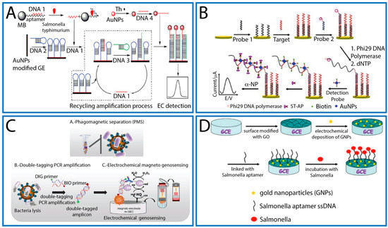 (A) Schematic illustration of signal amplified strategy based on entropy-driven molecule switch and EC nanoparticle probe for DNA and Salmonella Typhimurium detection (with permission of [68]); (B) the electrochemical sensing strategy developed for rapid detection of Salmonella by combining the rolling circle amplification with DNA–AuNPs probe (with permission of [69]); (C) schematic representation of the phagomagnetic separation of the bacteria followed by the double-tagging PCR, and the electrochemical magneto-genosensing of the attached bacteria (with permission of [65]); and (D) schematic illustration for the aptamer-based electrochemical detection of Salmonella based on a GO/GNPs modified glassy carbon electrode (with permission of [70]).