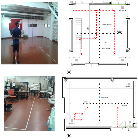 Figure 1 illustrates the two test beds considered to evaluate the localization algorithms. The two scenarios are, respectively, an atrium with 9.4 m× 7 m free space area (